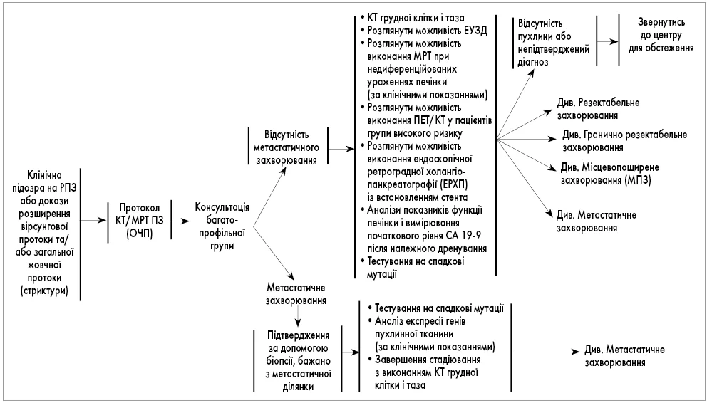 Положення СМД. Діагностика, диференційна діагностика, стадіювання РПЗ та оцінювання резектабельності пацієнтів із пухлинами ПЗ проводять у ЗОЗ, що надають спеціалізовану медичну допомогу, відповідно до алгоритму, зазначеному на рис. 1.