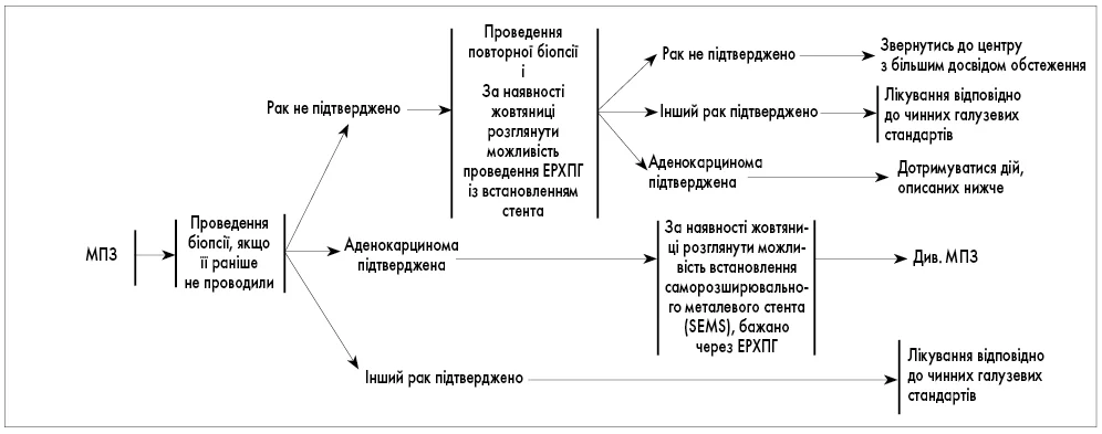 За наявності обтураційної жовтяниці найкращою практикою є голкова біопсія під контролем ЕУЗД та ендоскопічної ретроградної холангіопанкреатографії (РХПГ) для встановлення ендобіліарного стента під час одного сеансу наркозу.