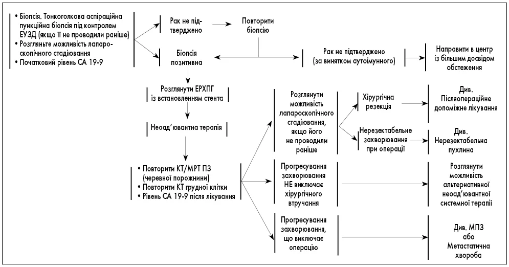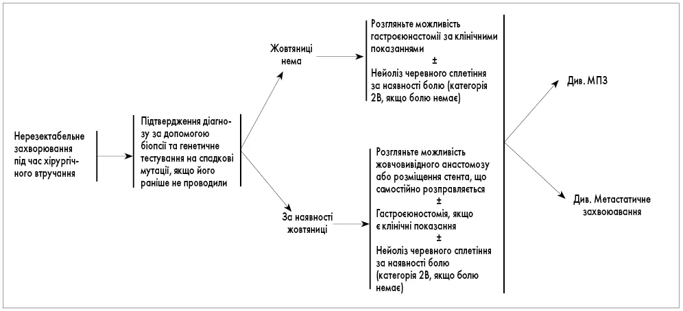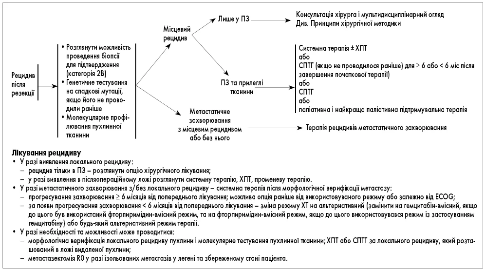 У разі функціонального статусу пацієнта 0-2 за ECOG призначається системна ХТ (схеми: FOLFIRINOX або модифікований FOLFIRINOX, NALIRIFOX або гемцитабін/цисплатин (при мутації в гені BRCA1/2).