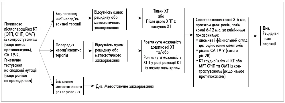 - Після закінчення неоад’ювантної та перед початком ад’ювантної терапії визначити рівень СА 19-9. Якщо він був підвищений перед початком лікування або лікування почалося пізніше ніж через 4 тижні після операції чи попереднього КТ – провести повторно КТ ОГП, ОЧП та ОМТ із в/в контрастуванням.