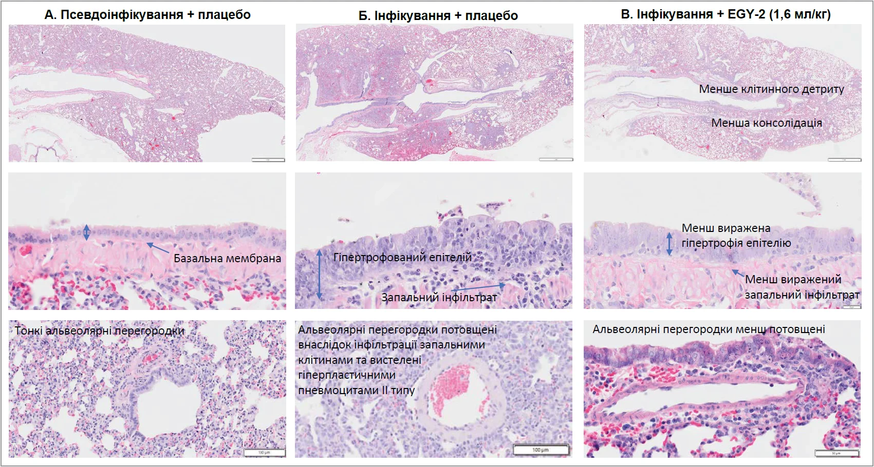 A. Контрольна група (псевдоінфікування + плацебо): нормальна структура легеневої тканини з тонкими альвеолярними перегородками. Б. Інфікування SARS-CoV‑2 + плацебо: виражені патологічні зміни, характерні для вірусної пневмонії, включно з гіпертрофією епітелію, інфільтрацією запальних клітин, потовщенням альвеолярних перегородок й ознаками консолідації легеневої тканини. В. Інфікування SARS-CoV‑2 + Енгістол (1,6 мл/кг/добу): зменшення вираженості запального процесу, менша інфільтрація запальними клітинами, менш виражена гіпертрофія епітелію та менше потовщення альвеолярних перегородок порівняно з групою плацебо.