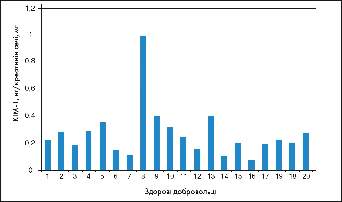 Зразки сечі, зібрані у 20 здорових осіб, були проаналізовані для визначення референтного діапазону KIM‑1 [33]. Значення для здорових добровольців коливалися від 60 до 837 пг/мл (рис. 4).