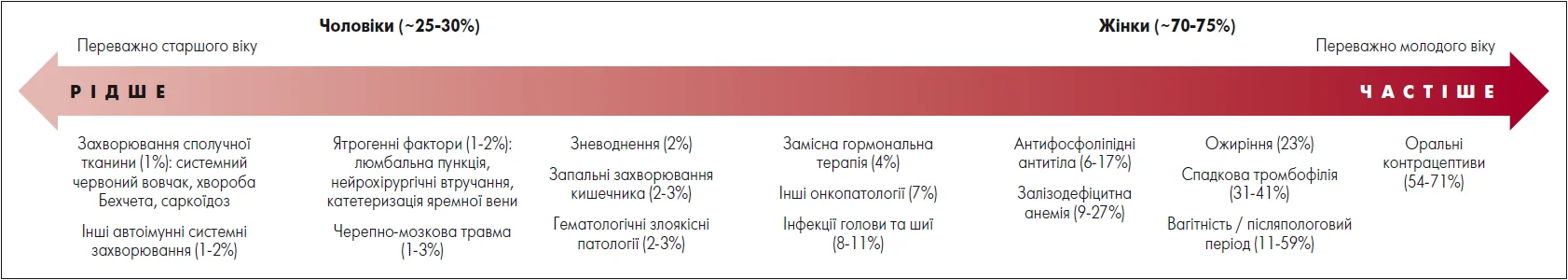 Загалом як молоді дорослі, так і жінки з інсультом мають вищий ризик первинної хибної діагностики та/або діагностичної затримки (Newman-Toker et al., 2014; Yu et al., 2021). Найпоширенішими факторами ризику ТВСГМ є використання оральних контрацептивів, вагітність, післяпологовий період та спадкові тромбофілії (рисунок) (Green et al., 2018; Silvis et al., 2016). Нещодавнє масштабне проспективне когортне дослідження показало, що у дорослих пацієнтів з ідентифікованим фактором ризику вік дебюту ТВСГМ був нижчим (Ranjan et al., 2023). При цьому наявність злоякісного новоутворення асоціювалася зі старшим віком виникнення ТВСГМ.