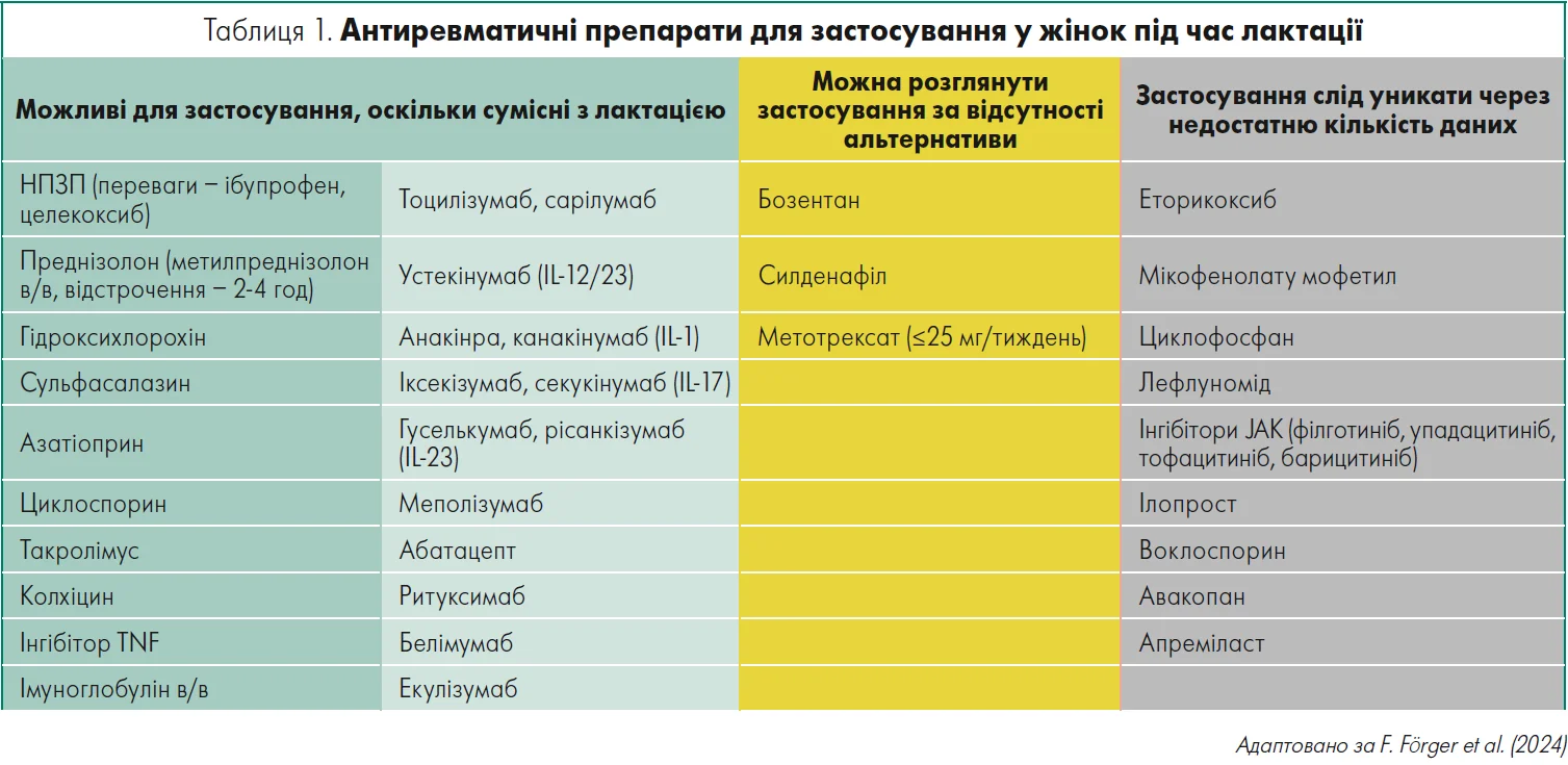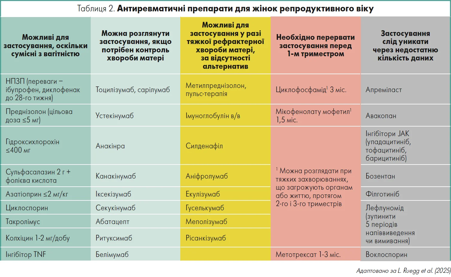 Окремо експертки зупинилися на змінах щодо безпеки застосування препаратів, які використовуються для лікування ревматичних захворювань під час вагітності й лактації, адже це критично важливо для здоров’я матері та дитини (табл. 1 і 2). Так, станом на 2025 р. накопичено нові дані щодо застосування гідроксихлорохіну (ГХХ). Метааналіз даних жінок з антифосфоліпідним синдромом показав, що додавання ГХХ до стандартної терапії асоційоване із вищим показником живонароджень (Berman et al., 2025). У когортному дослідженні серед пацієнток із системним червоним вовчаком встановлено, що приймання ГХХ знижує ризик прееклампсії, що має ключове значення для збереження здоров’я матері та плода (Nguyen et al., 2025).