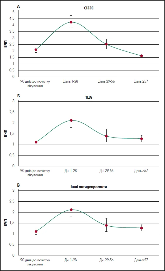 Рисунок. Графіки ВЧП і 95% ДІ у періодах ризику на тлі застосування СІЗЗС (А), ТЦА (Б) та інших антидепресантів (В) для ілюстрації схожих часових тенденцій щодо розвитку ПГ (пік у період ризику із 1-го по 28-й день)