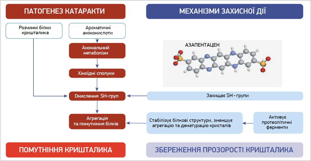 Азапентацен чинить багатофакторний вплив на ключові патогенетичні механізми катарактогенезу. Зокрема, він сприяє стабілізації білкових структур кришталика, зменшує агрегацію та денатурацію кристалів, а також модулює баланс між окисними та антиоксидантними процесами. Такий механізм дії є критично важливим для уповільнення прогресування катаракти, оскільки саме порушення білкової конформації та накопичення продуктів окисного стресу визначають втрату прозорості кришталика.