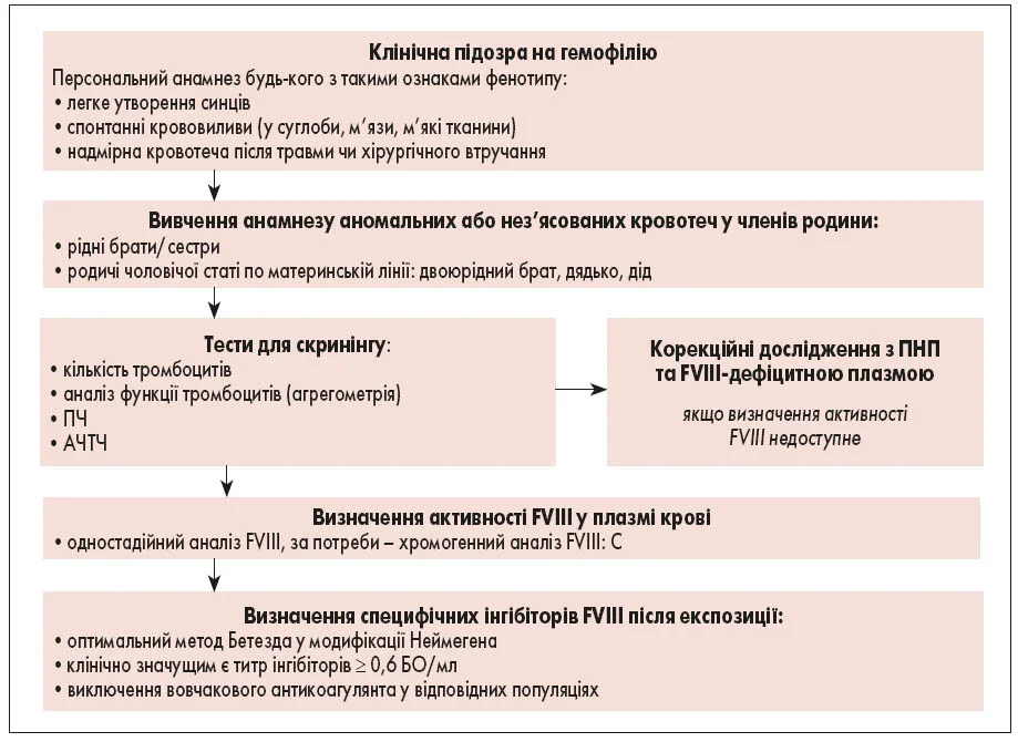 - збір скарг (аномальні, надмірні і надто тривалі кровотечі після травм чи медичних втручань, поява синців або гематом непропорційна до травматичного впливу або навіть без очевидної причини, типова локалізація крововиливів (суглоби, м’язи, м’які тканини), переважне ураження осіб чоловічої статі) та детального персонального і сімейного анамнезу пацієнта відповідно до алгоритму (рис. 1);