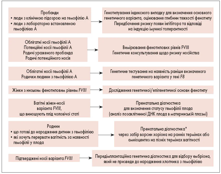 Під час генетичного консультування пацієнти повинні також отримати інформацію і поради щодо пренатальної діагностики, ведення вагітності та пологів у носіїв гемофілії.