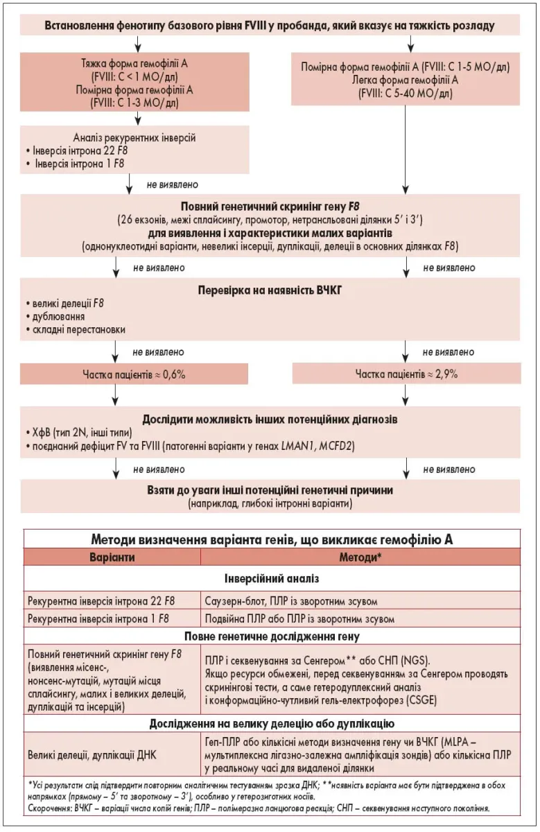 Обґрунтування. Генетична діагностика гемофілії має важливе значення для визначення біології захворювання, встановлення діагнозу у складних випадках, прогнозування ризику розвитку інгібіторів, виявлення жінок-носіїв і надання пренатальної діагностики за бажанням. Генетичне дослідження не завжди дає змогу виявити варіант мутації, яка зумовлює певний фенотип. Під час генетичного консультування ЛЗГ, направленої на генетичне тестування, необхідно завжди зазначати про таку можливість.