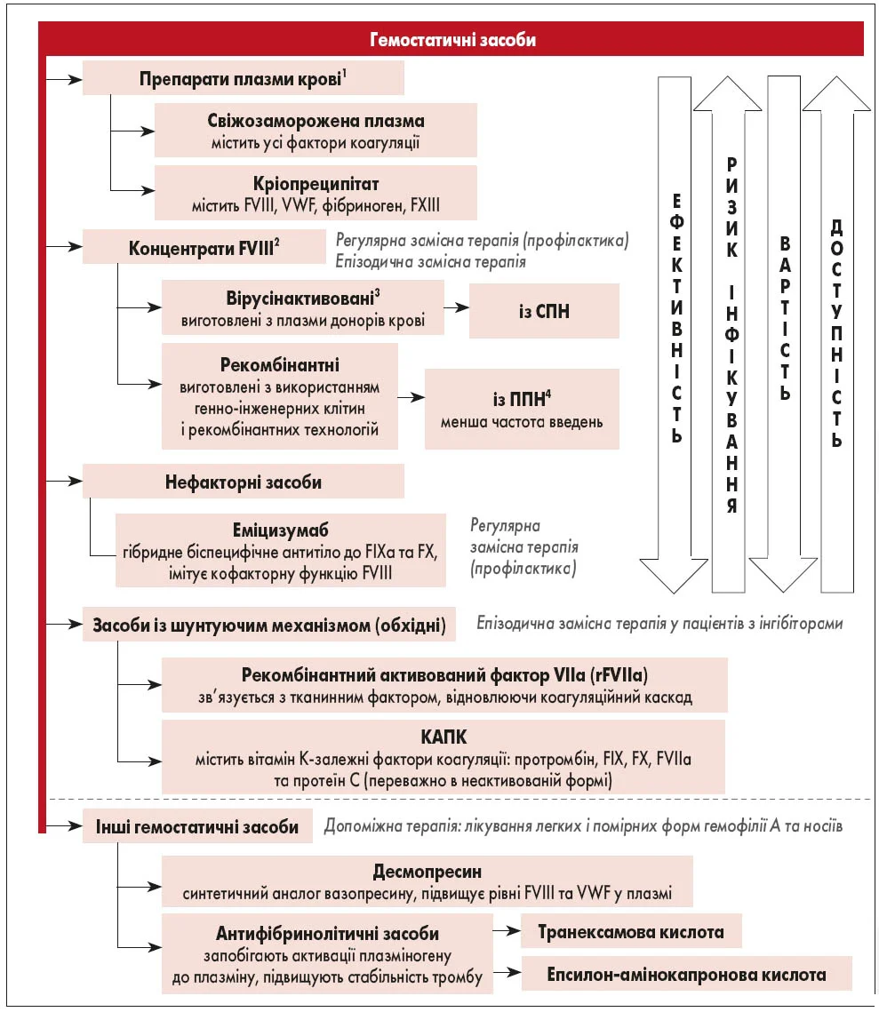 Лікарські засоби: гемостатичні (фактори згортання крові: фактор коагуляції крові VІІІ; активований рекомбінантний фактор коагуляції VII; десмопресин; еміцизумаб), антигеморагічні (амінокапронова кислота, транексамова кислота).