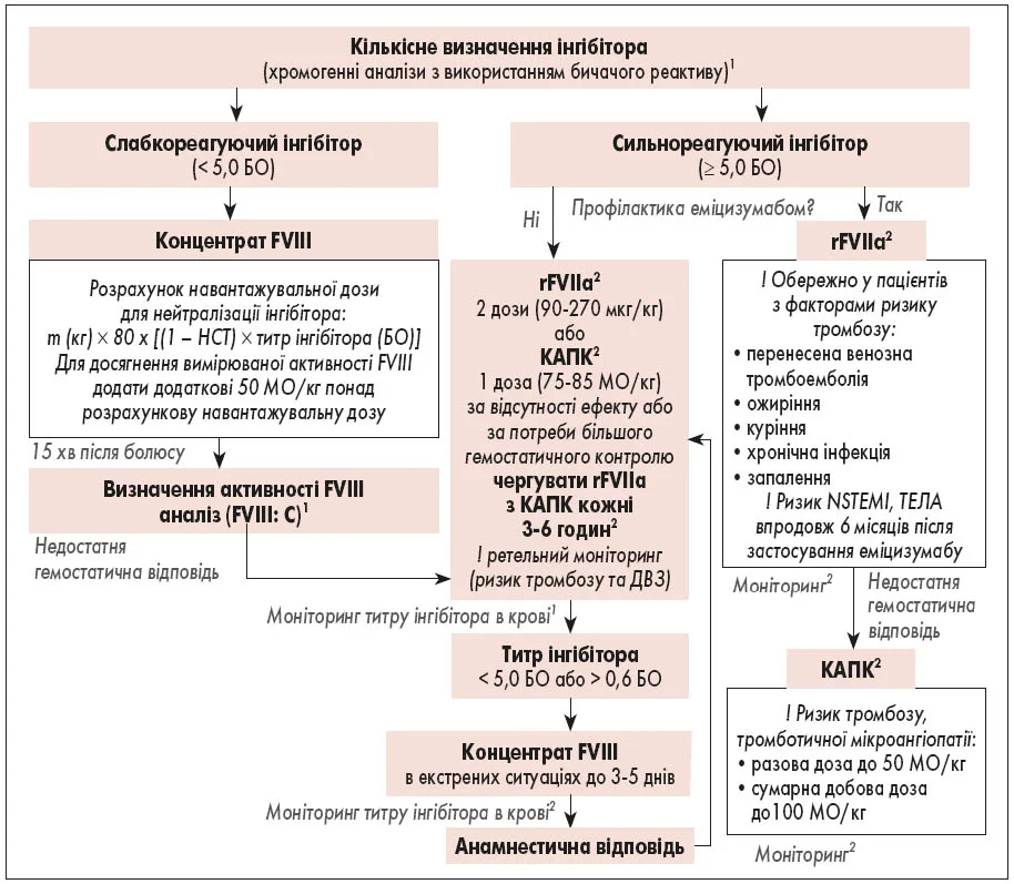 Для пацієнтів із гемофілією А та слабкореагуючими інгібіторами, що отримують еміцизумаб і готуються до серйозної операції або інвазивної процедури, рекомендовано препарат, що містить FVIII. У пацієнтів, які мають сильнореагуючі інгібітори, слід надавати перевагу rFVIIa перед КАПК через ризик тромботичної мікроангіопатії. Необхідно обережно застосовувати rFVIIa у пацієнтів, які отримують еміцизумаб і мають фактори ризику тромбозу (наприклад, перенесена венозна тромбоемболія, ожиріння, куріння, хронічна інфекція, запалення) через ризик гострого інфаркту міокарда без підйому сегмента ST та емболії легеневої артерії.