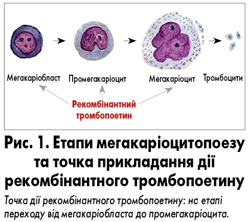 Стимуляція тромбопоезу дає змогу посилити сигналізацію і продукцію тромбоцитів, що сприяє скороченню періоду критичної тромбоцитопенії та зменшенню її глибини (DeFillipp Z., 2020). Опубліковані дослідження демонструють, що рівень ендогенного тромбопоетину корелює з кількістю тромбоцитів, а отже підвищення рівня цього цитокіну позитивно впливає на функціонування тромбопоезу. Рекомбінантний тромбопоетин, подібно до ендогенного, впливає на клітини-попередники тромбоцитарного ряду: мегакаріобласт, промегакаріоцит, мегакаріоцит, стимулюючи їх до дозрівання і відшнурування тромбоцитів. Важливо зазначити, що для реалізації цього процесу потрібен певний час – принаймні п’ять діб, тому ефект від введення препарату можна спостерегти лише згодом, а не одразу після ін’єкції (рис. 1). Під час застосування рекомбінантного тромбопоетину можна очікувати підвищення кількості тромбоцитів, причому цей процес характеризується сприятливим профілем безпеки: не утворюються нейтралізуючі антитіла, а ризик тромбоутворення незначний (Kuter D.J., 2022).