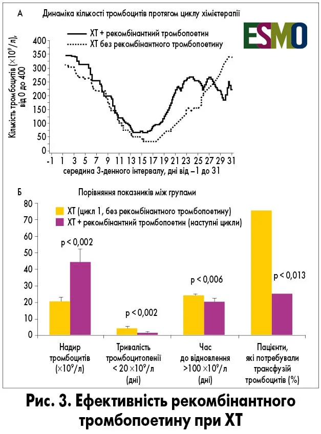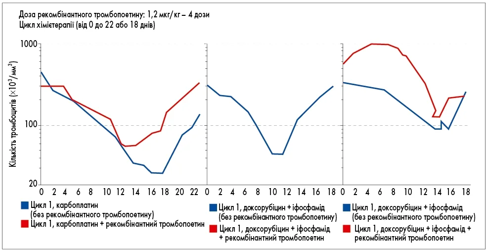 Стимуляція тромбопоезу після ХТ сприяє досягненню двох важливих цілей: зменшенню глибини тромбоцитопенії та скороченню її тривалості. Зрозуміло, що можливості такого впливу мають певні межі, однак аналіз графіків відновлення тромбоцитів наочно демонструє переваги стимуляції. При поєднанні ХТ із введенням рекомбінантного тромбопоетину глибина тромбоцитопенії є меншою, а її тривалість – коротшою порівняно з відсутністю стимуляції (рис. 2). Хоча відновлення рівня тромбоцитів розпочинається дещо пізніше, це не є критичним. Для клінічної практики принципово важливою є саме менша глибина надиру – найнижчої точки тромбоцитопенії – та скорочення її тривалості, що дає змогу розпочати наступний курс ХТ вчасно, без необхідності його відтермінування (Young N.S., 2009).