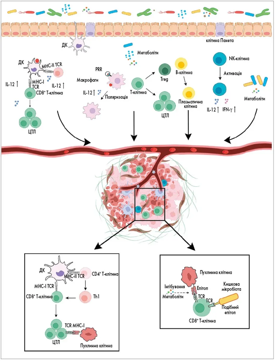 Рис. 1. Вплив кишкової мікробіоти на вроджений та адаптивний імунітет у кишечнику і пухлинному мікрооточенні