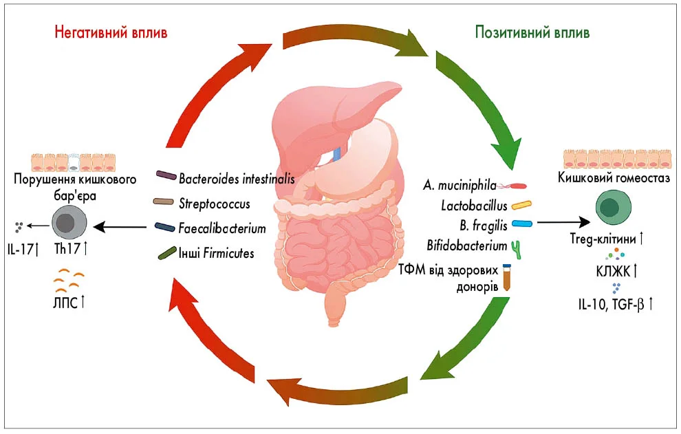 Уявлення про людський організм як замкнену систему давно відійшло в минуле. Сьогодні ми знаємо, що всередині нас мешкає приблизно 40 трильйонів мікроорганізмів включно з бактеріями, грибами, археями і вірусами. Цікаво, що кількість їхніх генів перевищує людський геном більш ніж у сто разів. Серед усіх мікробних популяцій організму особливе місце належить кишковій мікробіоті, яка колонізує товсту кишку і становить понад 97% загальної мікробної популяції. І це не просто «пасажири» – кишечник містить до 60-70% периферичних імунних клітин, що дає підстави вважати його найбільшим периферичним імунним органом. Мікробні метаболіти, зокрема коротколанцюгові жирні кислоти та жовчні кислоти, відіграють вирішальну роль у формуванні вродженого й адаптивного імунітету.
