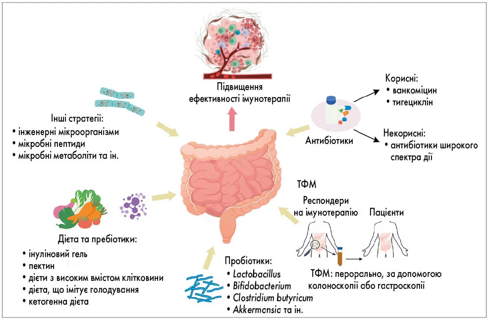 Кишкова мікробіота відіграє ключову роль у формуванні імунної відповіді при онкологічних захворюваннях, впливаючи на ефективність терапії через модуляцію імуноцитів, перебудову пухлинного мікрооточення і секрецію специфічних метаболітів. Останні дослідження свідчать, що такі стратегії, як трансплантація фекальної мікробіоти (ТФМ), застосування пробіотиків і дієтотерапія, є перспективними методами підвищення чутливості до інгібіторів контрольних точок імунітету (ІКТ) та адоптивної клітинної терапії. Крім того, корекція мікробного складу дає змогу суттєво знизити частоту і тяжкість імуноопосередкованих небажаних явищ.