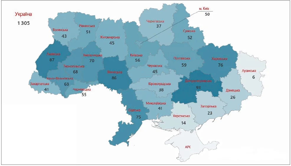 Рис. 1. Розподіл кількості надавачів спеціалізованої паліативної допомоги з угодами, укладеними до 25.02.2025