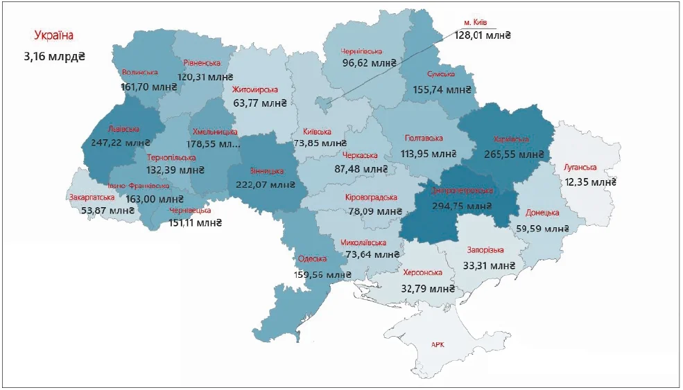 Так, для надання спеціалізованої паліативної допомоги у стаціонарі лише у 2024 р. законтрактовано 751 медзаклад, тоді як на мобільну паліативну допомогу – 1 210 надавачів. А станом на 25 лютого 2025 р. паліативну (стаціонарну і мобільну) допомогу надавали 1 305 суб’єктів незалежно від форм власності (зокрема 41 на Закарпатті) на загальну суму 3,16 млрд гривень (на Закарпатті – майже на 54 млн грн) (рис. 1, 2).