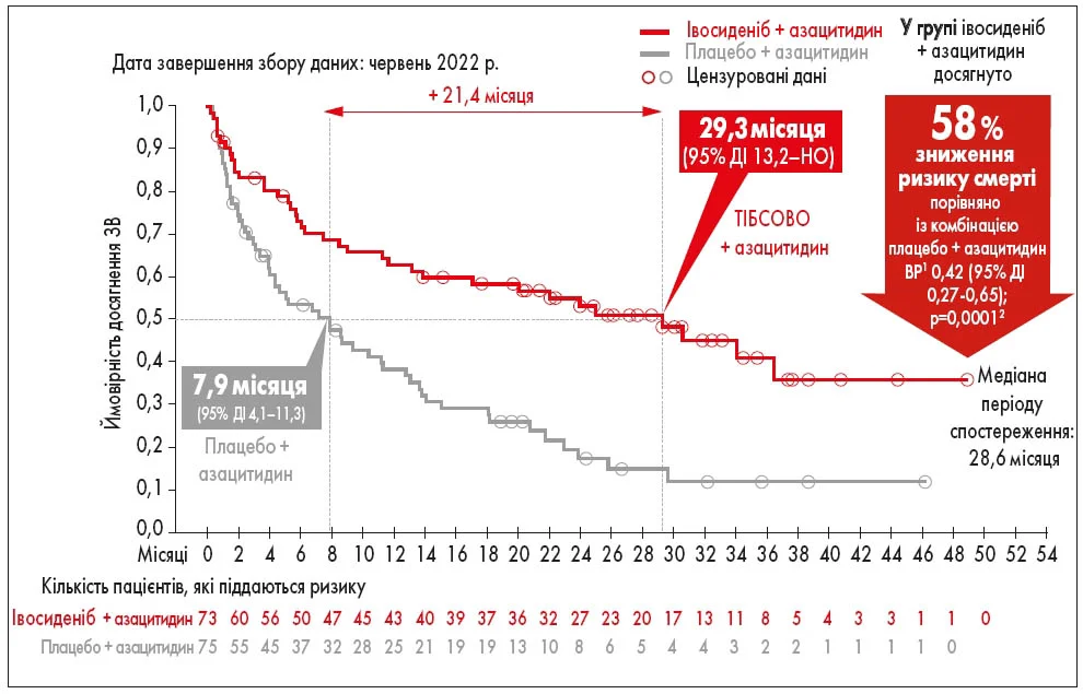 Рис. 1. Дані довгострокового спостереження, що підтвердили клінічно і статистично значущу перевагу комбінації івосиденіб + азацитидин (De Botton et al., 2023; Montesinos P. et al., 2022)