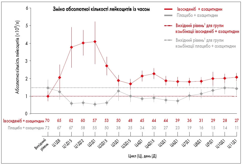Однією з важливих схем лікування для таких пацієнтів є комбінація івосиденібу з азацитидином, оскільки івосиденіб розблоковує диференціювання, а азацитидин блокує неконтрольовану проліферацію злоякісного клону. Така комбінація призводить до покращення показників навіть п’ятирічної виживаності без рецидиву, яка збільшується вдвічі під час застосування цього лікування порівняно з монотерапією азацитидином. Загальна виживаність також суттєво покращується (NCCN, 2024; Marcucci G., 2010; Paschka P., 2010). Особливо демонстративними є дані щодо динаміки абсолютної кількості нейтрофілів під час лікування. Під час застосування монотерапії азацитидином пацієнт проходить через доволі тривалий стан нейтропенії з високим ризиком смерті від інфекційних ускладнень. На противагу цьому під час застосування івосиденібу спостерігається підвищення кількості нейтрофілів, що забезпечується саме диференціюванням власних клітин. Доведено, що ці нейтрофіли можуть виконувати всі свої імунні функції та захищати пацієнта від бактеріальних ускладнень (рис. 2; Dohner H., 2022; Montesinos P., 2022).