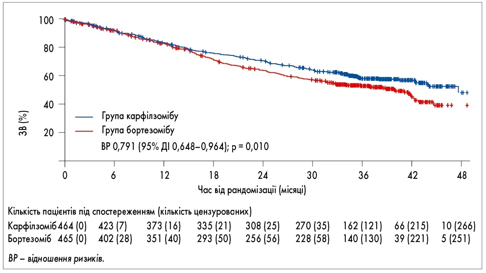 Результати дослідження продемонстрували статистично значуще покращення ВБП у групі карфілзомібу: медіана ВБП становила 18,7 місяця у групі Kd порівняно з 9,4 місяця у групі Vd (ВР 0,53; 95% ДІ 0,44-0,65; p < 0,0001). Крім того, за результатами проміжного аналізу ЗВ було виявлено значуще покращення на користь карфілзомібу (медіана ЗВ – 47,6 проти 40,0 місяця; ВР 0,79; 95% ДІ 0,65-0,96; p = 0,010; рис. 1) [7]. Скорегована за експозицією частота небажаних явищ ≥ 3 ступеня була подібною між групами, хоча у групі карфілзомібу частіше спостерігалися серцево-судинні події, зокрема артеріальна гіпертензія та анемія, тоді як у групі бортезомібу – периферична нейропатія [6, 7].