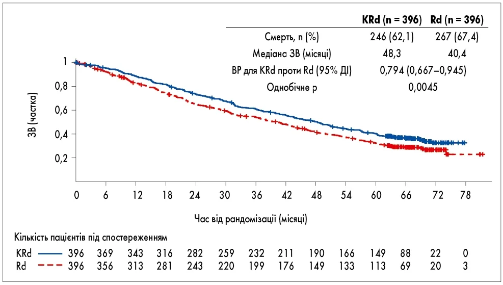 Фінальний аналіз ЗВ продемонстрував статистично значуще покращення ЗВ у групі KRd: медіана ЗВ становила 48,3 місяця у групі KRd проти 40,4 місяця у групі Rd (ВР 0,79; 95% ДІ 0,67-0,95; p = 0,0045). Медіана ВБП становила 26,3 проти 17,6 місяця на користь триплетної комбінації. Частота загальної відповіді (ЧЗВ) у групі KRd сягала 87,1% порівняно з 66,7% у групі Rd, водночас частка пацієнтів, які досягли повної відповіді або кращої, становила 31,8 і 9,3% відповідно (рис. 2) [8].