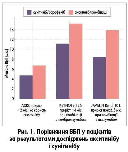 Подальші зміни відбулися завдяки комбінаціям акситинібу з імунотерапією. У дослідженні KEYNOTE‑426 (2019) поєднання акситинібу з пембролізумабом забезпечило медіану ВБП 15,1 проти 11,1 місяця для сунітинібу, а ЧОВ сягнула 59,3%. Подібні результати продемонструвало дослідження JAVELIN Renal 101, де акситиніб у комбінації з авелумабом перевершив сунітиніб за ключовими показниками (рис. 1, 2).