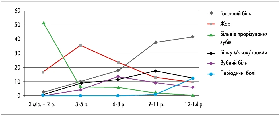 Рисунок. Вікова динаміка причин болю у дітей (% дітей, які відчували біль протягом останніх трьох місяців)