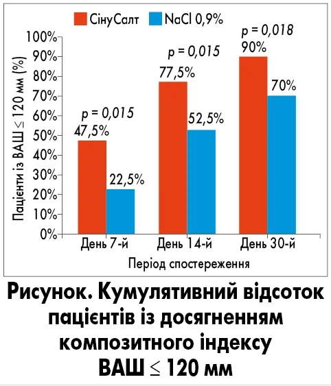 Первинну ціль дослідження – час до досягнення композитного індексу ВАШ ≤ 120 мм – успішно досягла значно більша кількість пацієнтів у групі СінуСалт порівняно з контрольною групою. Аналіз методом Kaплана – Mаєра продемонстрував статистично значущу перевагу ксилітол-вмісного розчину (log-rank тест, p = 0,003).