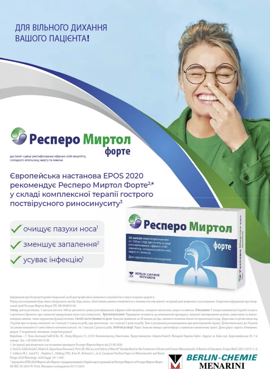 Отже, сучасний підхід до лікування риносинуситу ґрунтується на відмові від необґрунтованої антибіотикотерапії на користь патогенетичного лікування з підтримкою мукоциліарного транспорту. Більшість випадків риносинуситу має вірусну природу й минає без лікування антибіотиками. Респеро Миртол дає змогу досягти покращення без ризику антибіотикорезистентності та руйнування мікробіому. Дотримання клінічних рекомендацій, виважений підхід до антибіотиків, раннє призначення патогенетичної терапії покращують результати лікування та мінімізують ускладнення в педіатричній практиці.