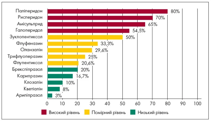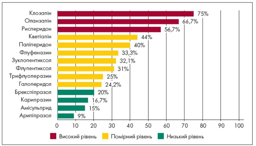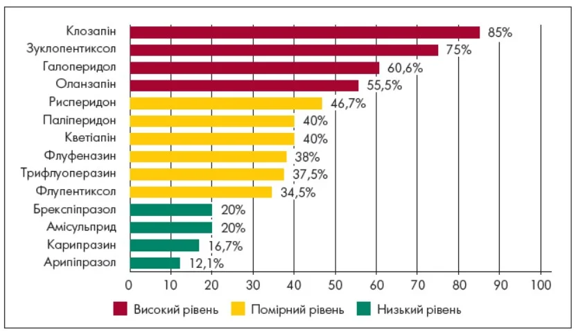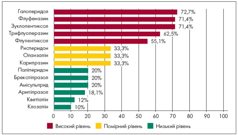 Найвищу частоту ЕПС було виявлено при застосуванні галоперидолу (72,7%), зуклопентиксолу (71,4%), флуфеназину (71,4%), трифлуоперазину (62,5%) та флупентиксолу (55,1%), що очікувано для типових нейролептиків із потужним D2-блокувальним ефектом. Серед атипових антипсихотиків помірну частоту ЕПС (33,3%) було зафіксовано при використанні оланзапіну, рисперидону та карипразину. До препаратів із найменшою кількістю екстрапірамідних порушень належали клозапін (10%), кветіапін (12%), арипіпразол (18,1%), а також амісульприд, паліперидон і брекспіпразол (кожний по 20%) (рис. 2).