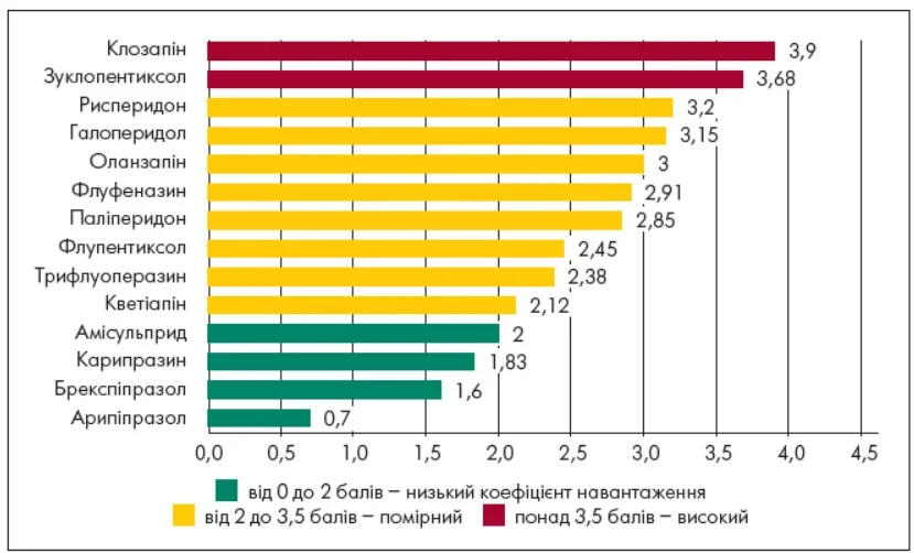 Водночас найвищі показники коефіцієнта побічного навантаження були зафіксовані при застосуванні зуклопентиксолу (3,68) та клозапіну (3,9), що вказувало на суттєвішу ймовірність виникнення клінічно значущих побічних реакцій. Це зумовлювало необхідність ретельного оцінювання співвідношення користі та ризику, проведення систематичного клінічного нагляду, а також постійного моніторингу соматичного статусу хворого для своєчасного виявлення та корекції можливих ускладнень.