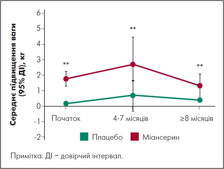 Дані тривалих клінічних досліджень підтверджують, що у пацієнтів, які отримували міансерин впродовж 4‑9 місяців, середнє збільшення маси тіла становило лише 2 кг (рисунок).