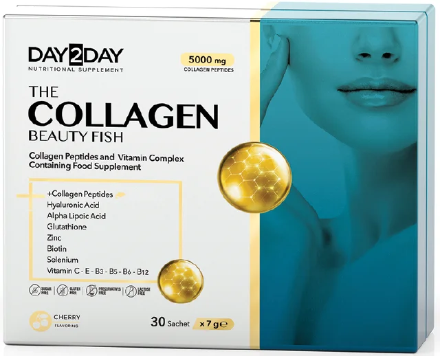 Морський колаген від бренду Day2Day The Collagen Beauty Fish містить гідролізовані пептиди риб’ячого колагену I типу та вітамінно-мінеральний комплекс. Комплекс підтримує імунну систему та допомагає зменшити появу зморщок.