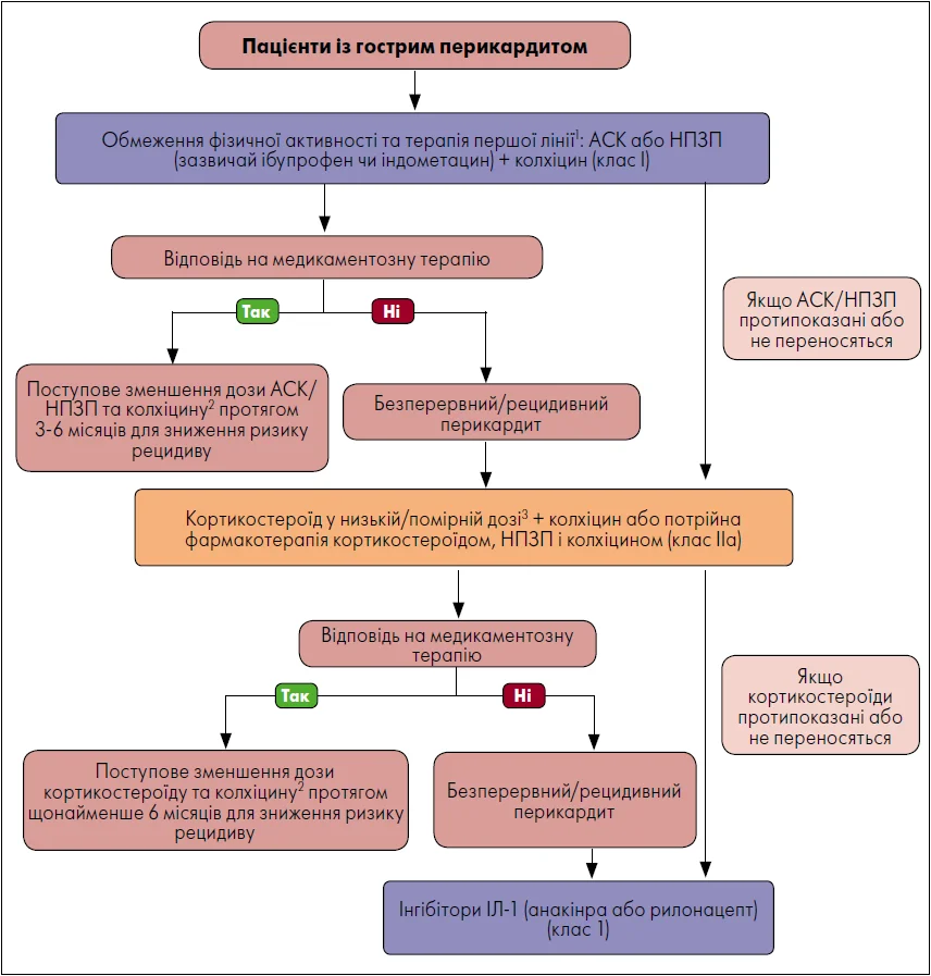 Колхіцин є препаратом першої лінії у пацієнтів із перикардитом як доповнення до ацетилсаліцилової кислоти (АСК) / НПЗП або кортикостероїдів для зменшення рецидивів (І, А) (Avondo et al., 2021; Melendo-Viu et al., 2023). Застосування високих доз АСК або НПЗП з інгібіторами протонної помпи рекомендоване як лікування першої лінії у хворих на перикардит для контролю симптомів та зниження частоти рецидивів (І, В) (Lotrionte et al., 2010). Препарати класу антагоністів рецептора інтерлейкіну‑1 (ІЛ‑1), як-то анакінра або рилонацепт, слід призначати особам із рецидивним перикардитом за умови неефективності терапії першої лінії та кортикостероїдів, а також при підвищенні рівня С-реактивного білка для зменшення повторних епізодів і розгляду можливості відміни кортикостероїдів (І, А) (Klein et al., 2021).