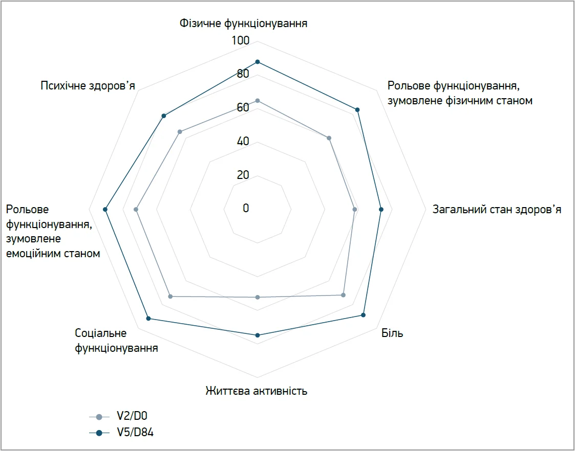 Примітка: опитувальник SF‑36 охоплює 8 доменів здоров’я за 36 запитаннями, відповіді на які перетворюються на бали від 0 (найгірший стан здоров’я) до 100 (оптимальний стан здоров’я).