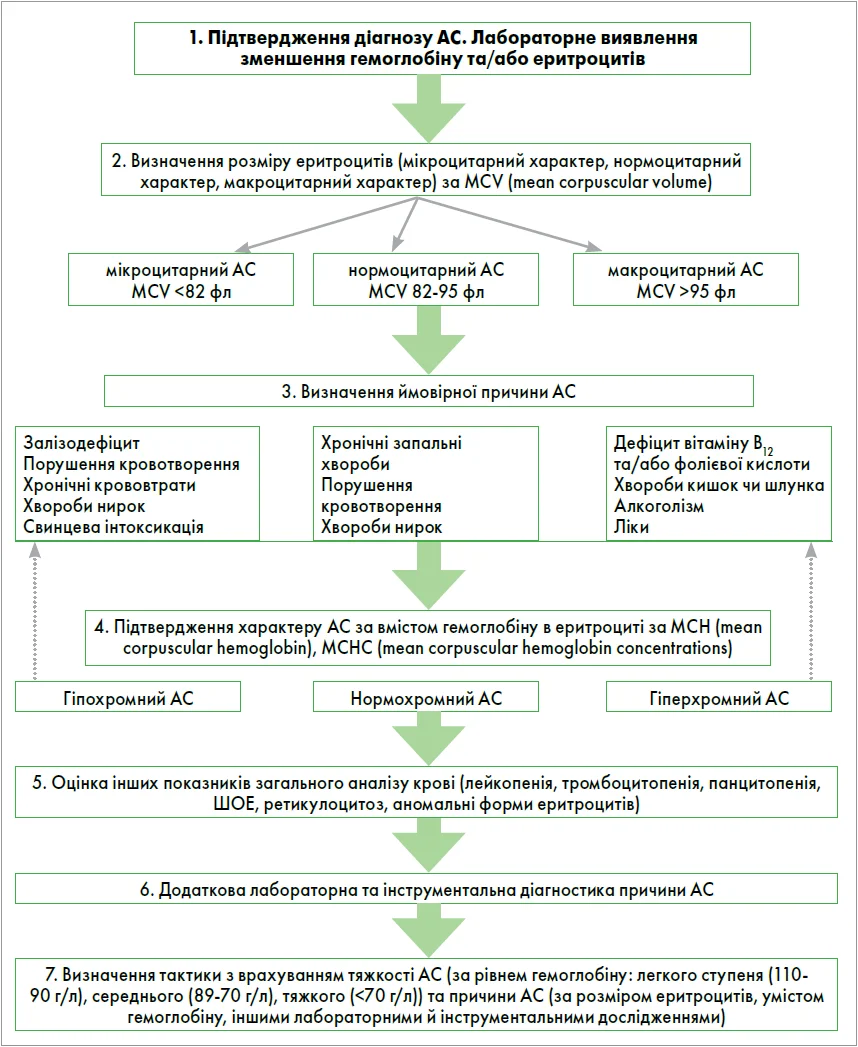 Після виявлення зменшення гемоглобіну та/або еритроцитів діагностичний процес найкраще розпочинати з визначення розміру еритроцитів (мікроцитарний, нормоцитарний та макроцитарний АС), що раніше проводилося візуально, а тепер визначається за показником MCV (mean corpuscular volume) (табл. 1): мікроцитарний (MCV <82 фл), нормоцитарний (MCV 82-95 фл), макроцитарний АС (MCV >95 фл). Це дозволяє передбачити ймовірну причину АС (табл. 2). Саме основні причини АС зумовлюють провідні клінічні прояви, відрізняються за умов мікро-, нормо- і макроцитарних АС, мають визначальне значення для стратегії та тактики лікування, його ефективності. Однак у певних випадках основні причини АС можуть не зазнавати корекції, що зумовлюватиме вкрай низьку ефективність лікування АС.