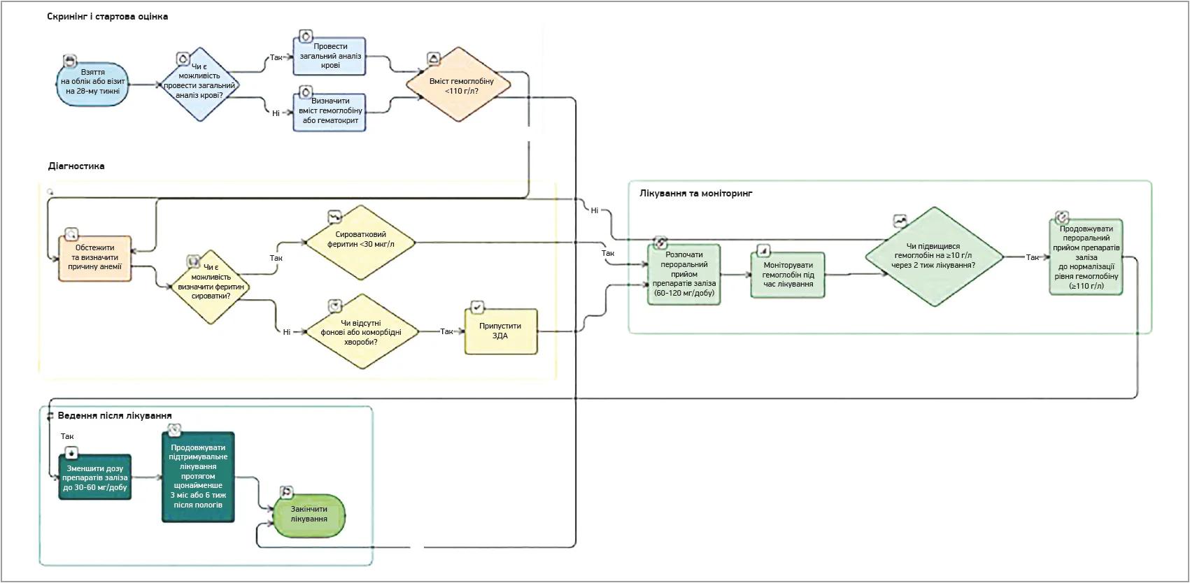 Лікування ЗДА слід продовжувати до нормалізації концентрації гемоглобіну до рівня ≥110,0 г/л. Після цього дозу заліза слід зменшити до профілактичної (30-60 мг елементарного заліза на добу) для запобігання рецидиву анемії. Це лікування необхідно продовжувати щонайменше протягом 3 міс або 6 тиж після пологів (залежно від того, що довше) для відновлення запасів заліза (рис.).
