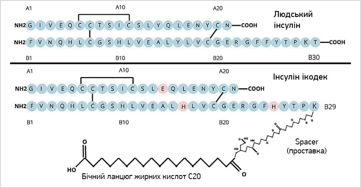 Рис. 1. Коротка ілюстрація двовимірних структур нативного людського інсуліну й інсуліну ікодек