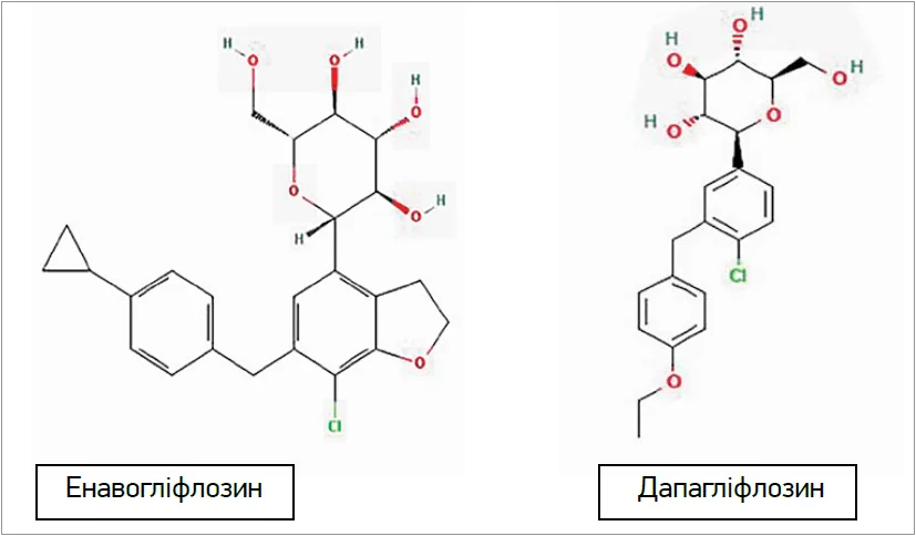 Рис. 2. Хімічна структура енавогліфлозину [12] та дапагліфлозину [13]