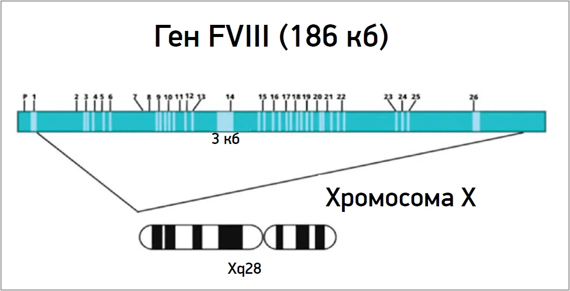 FVIII – це високомолекулярний глікопротеїн, що діє як кофактор у каскаді зсідання крові. Він розташований на довгому плечі Х-хромосоми в позиції Xq28 (рис. 1).