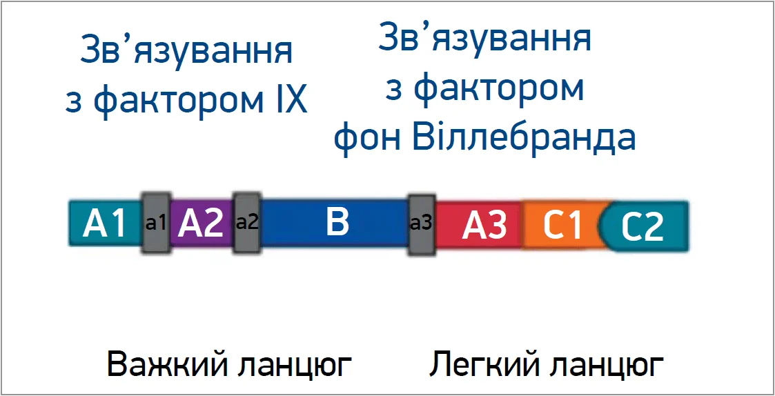 Зрілий білок FVIII має гетеродимери з двома ланцюгами, що складаються з трьох гомологічних доменів А, одного домену В та двох гомологічних доменів С, які розташовані в порядку (A1-A2-B) важкого ланцюга та (A3-C1-C2) – легкого (рис. 2) [5]. Домени мають життєво важливе значення для функціонування FVIII, оскільки кожен з них містить специфічні сайти зв’язування для компонентів каскаду коагуляції.