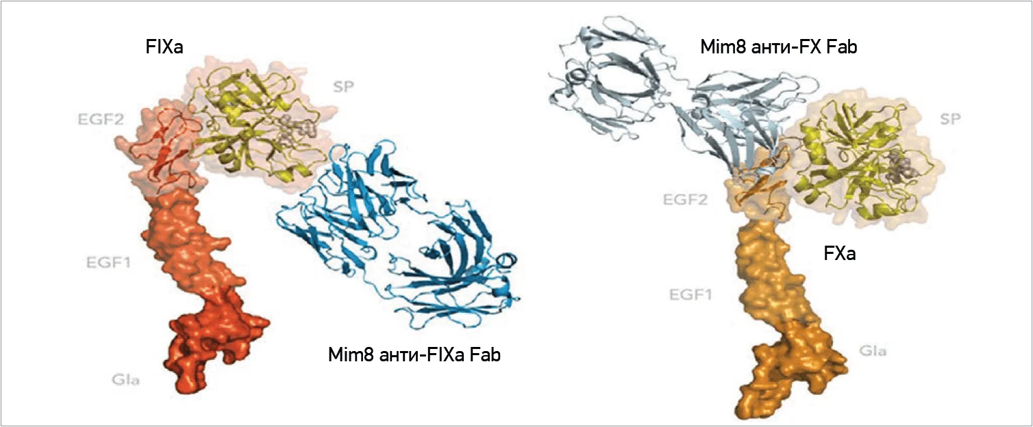 Рис. 3. Кристалічні структури фрагментів Mim8 анти-FIXa й анти-FX Fab у комплексі з їхніми відповідними мішенями