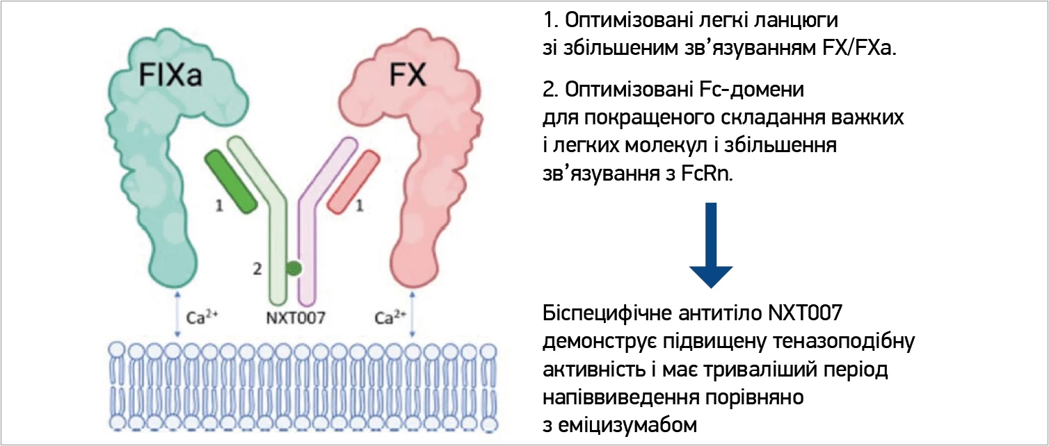 NXT007 було розроблено компанією Chugai Pharmaceutical Co., Ltd., членом Roche Group, на основі структури препарату Hemlibra® (еміцизумаб) з метою оптимізації активності й періоду напіввиведення для подальшого підвищення ефективності, дозування та зручності введення. NXT007 з’єднує фактори IXa та фактор X – білки, необхідні для активації природного каскаду зсідання крові (рис. 4) [18].