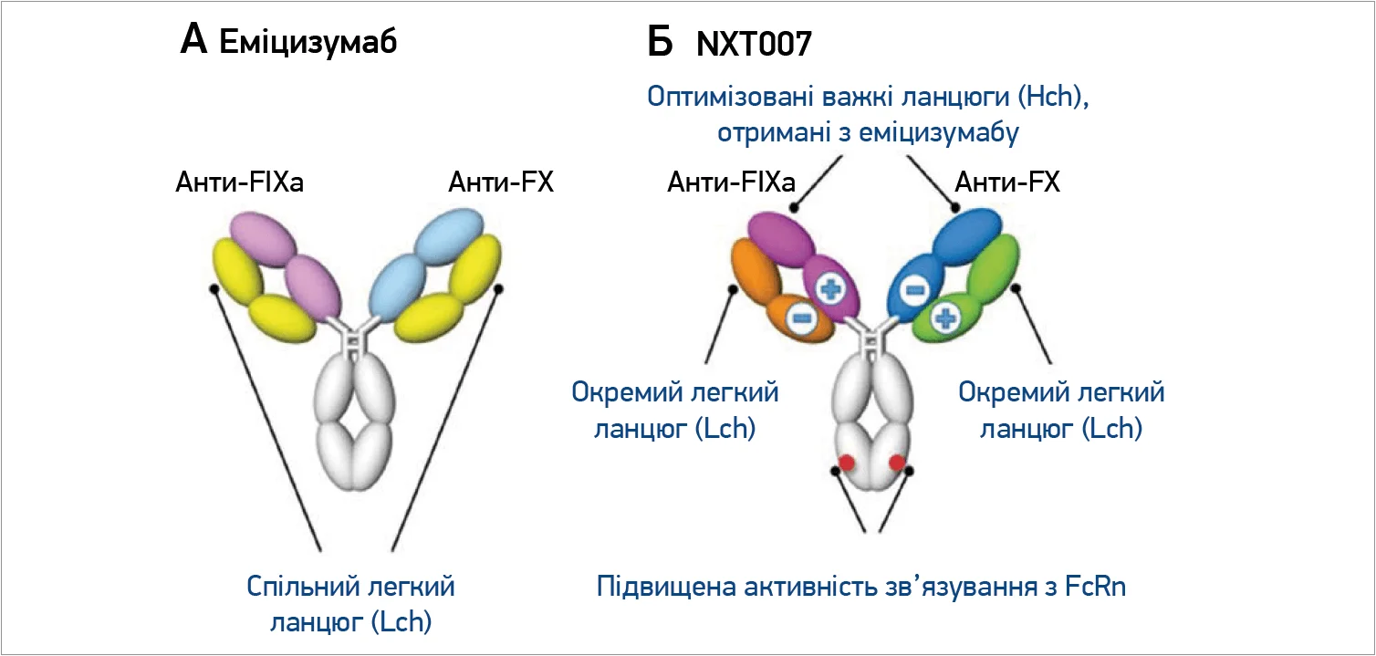Це нове біспецифічне антитіло було сконструйовано шляхом модифікації еміцизумабу та має дві важливі відмінності від нього. По-перше, NXT007 має два нові легкі ланцюги, що дозволяє подальшу оптимізацію спорідненості зв’язування й кінетики з FIXa та FX. По-друге, фармакокінетичні характеристики були додатково покращені завдяки змінам Fc-доменів антитіла, які посилюють взаємодію з рециркулювальним рецептором FcRn (рис. 5).