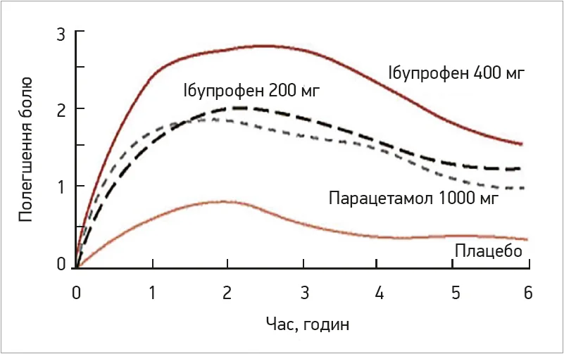 Опитування показали, що пацієнти, які відчувають біль, прагнуть до швидкого та значного зменшення болю (≥50% від початкового рівня), без рецидивів та, в ідеалі, без побічних ефектів (Moore R.A. et al., 2013b; Lipton R.B. et al., 2002). Як найбільш чутлива та достовірна модель для оцінки відносної ефективності аналгетиків часто використовується модель зубного болю при видаленні третіх молярів. Так, Кокранівський огляд Bailey та співавт. (2014) об’єднав дані 676 пацієнтів, які приймали одноразово ібупрофен 400 мг або парацетамол 1000 мг одразу після видалення третього моляра. Було встановлено, що ібупрофен 400 мг забезпечив щонайменше 50% полегшення болю протягом 6 год у більшої кількості пацієнтів: на 19% більше порівняно з парацетамолом 1000 мг. Порівняльна динаміка полегшення гострого болю при прийомі ібупрофену та парацетамолу показана на рисунку.