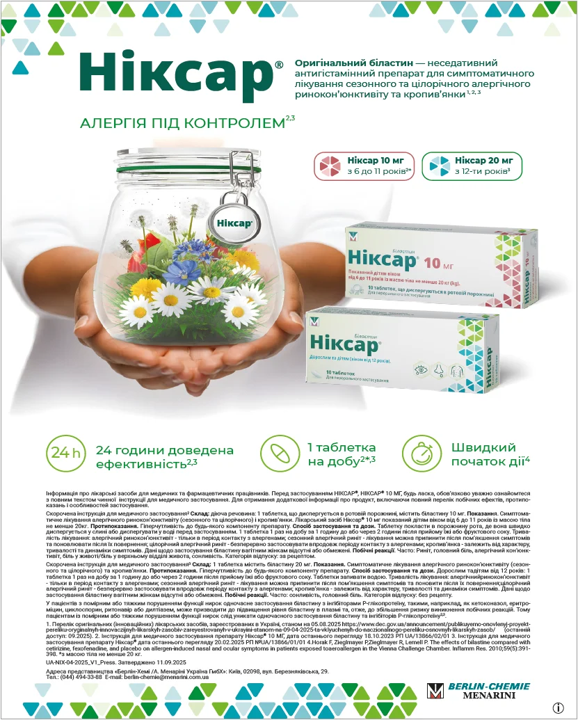 Ефективність біластину (Ніксар®) підтверджена клінічно. У подвійно сліпому рандомізованому перехресному дослідженні за участю пацієнтів із сезонним АР, індукованим пилком амброзії, було продемонстровано, що після одноразового прийому біластину 20 мг назальні та очні симптоми за шкалою TNSS суттєво зменшувалися вже через 1 год після провокації алергеном (Horak та співавт., 2010). Водночас тривалість ефекту біластину перевищувала 24 год, що було значно довшим, ніж у фексофенадину 120 мг, та супроводжувалося вираженим полегшенням очних симптомів – свербежу, почервоніння й сльозотечі.