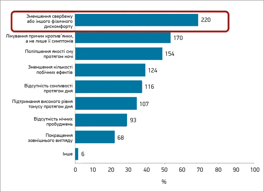 Результати інтернет-опитування, проведеного серед 321 дорослого пацієнта з діагнозом ХК у Німеччині та Франції, показали, що 69% респондентів спостерігають свербіж і фізичний дискомфорт як невирішену проблему (рис. 1). Серед інших значущих труднощів пацієнти найчастіше називали порушення сну, денну сонливість та зниження працездатності (Maurer M. і співавт., 2009).