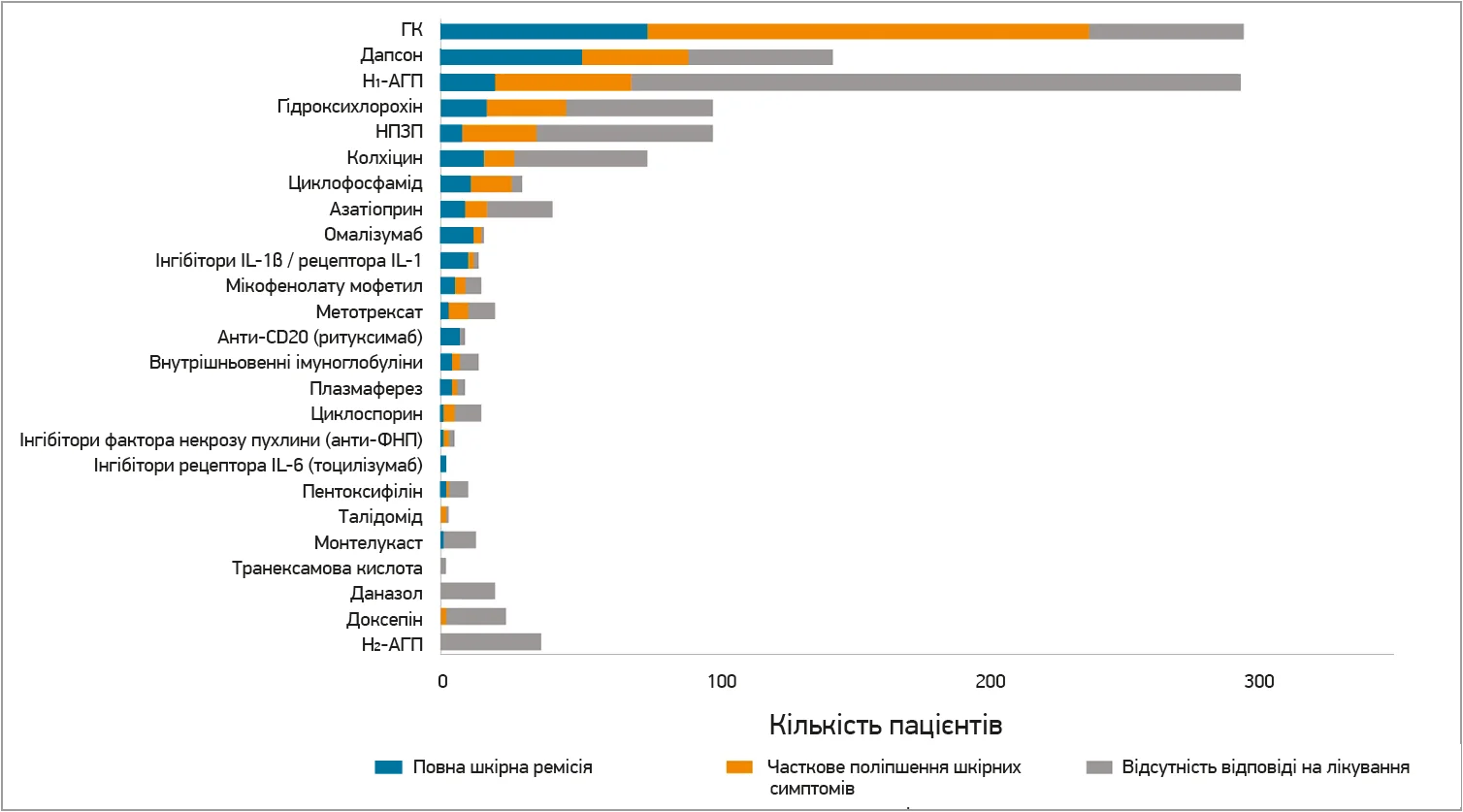 На сьогодні жоден препарат не має офіційного схвалення для лікування УВ, а терапевтичні рекомендації базуються переважно на описах клінічних випадків та ретроспективних дослідженнях (Kolkhir і співавт., 2019). У систематичному огляді, проведеному P. Kolkhir та співавт. (2019), узагальнено дані щодо ефективності різних лікарських засобів при УВ (рис. 2).