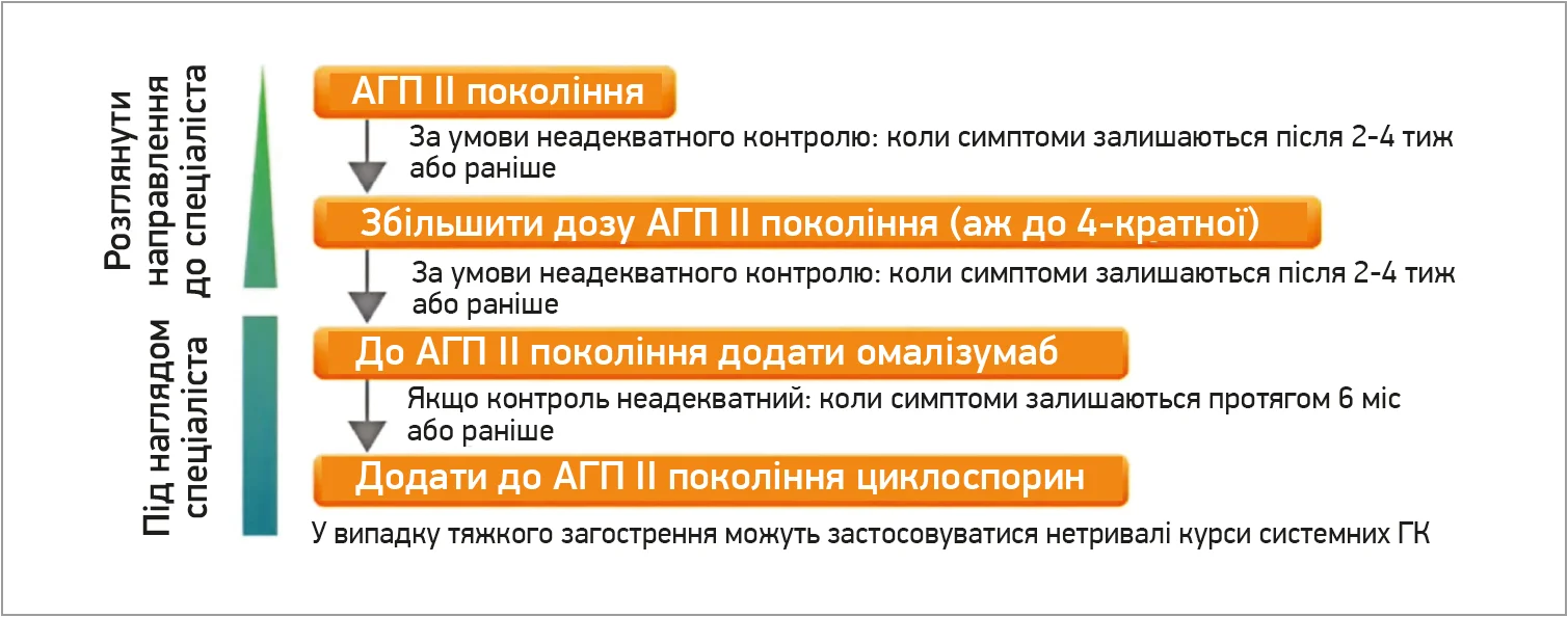 Відповідно до міжнародних настанов EAACI/GA²LEN/EuroGuiDerm/APAAACI (2021), терапія ХК базується на поетапному підході. Цей алгоритм відображено на рисунку 3; він дозволяє поступово підбирати оптимальну схему лікування залежно від рівня контролю симптомів.